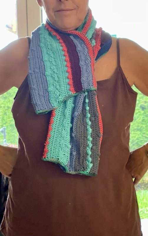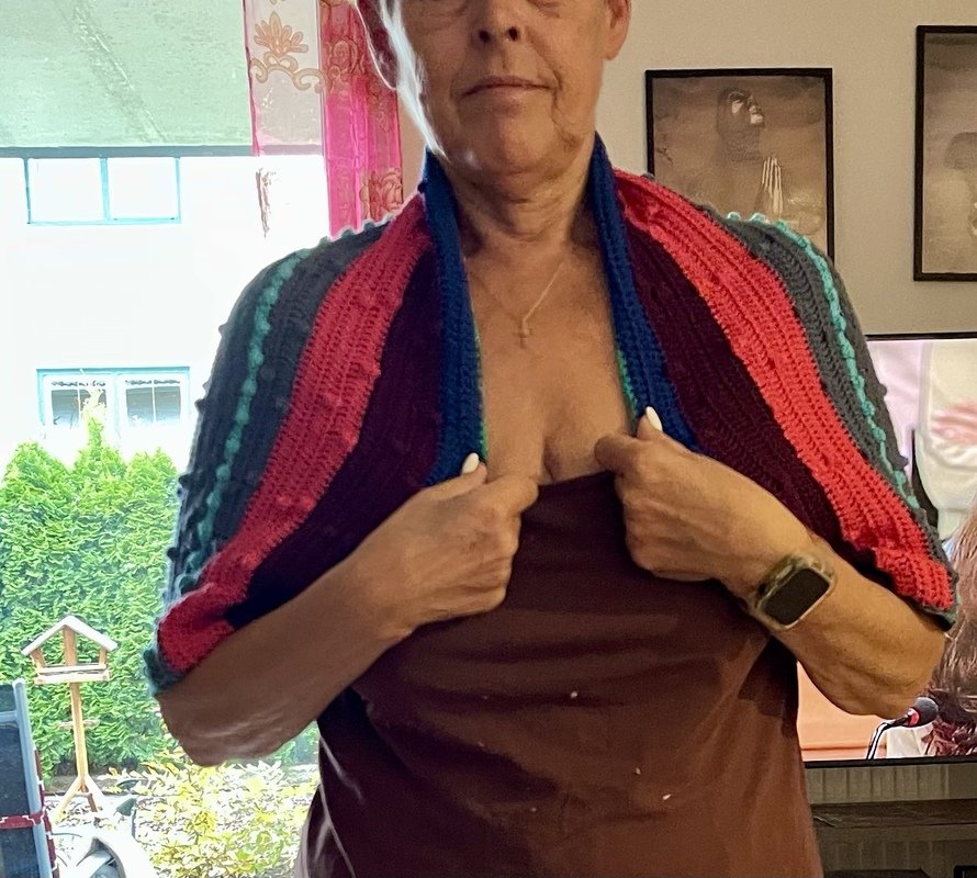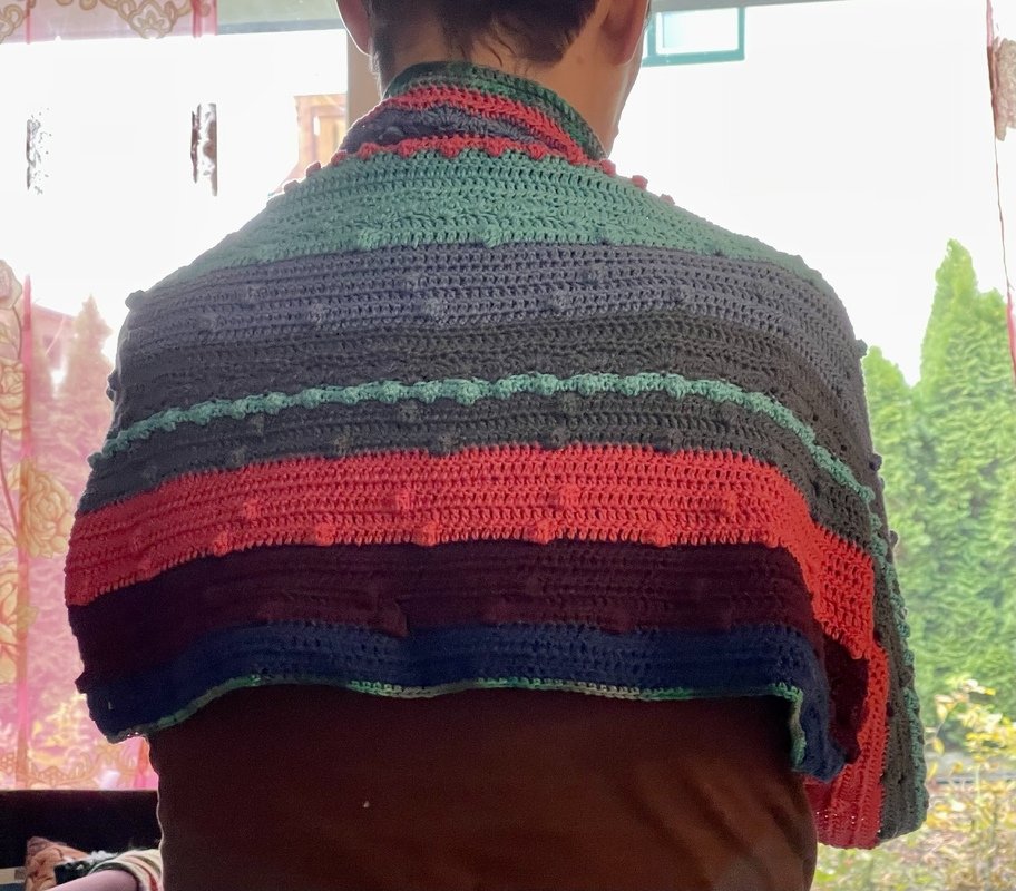 Hier habe ich mir einen Schulterwärmer gehäkelt, der aufgrund der Ärmeln auch optimal als Schal genutzt werden kann.