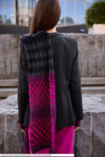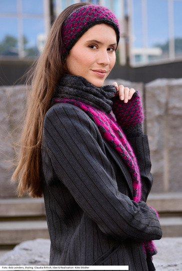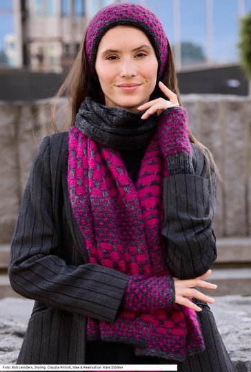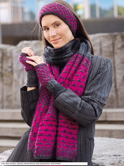 Dieses bezaubernde Set begeistert gleich in mehrerlei Hinsicht. Schachbrett-, zweierlei Waben- (mal groß, mal klein) und ein Rippenmuster sorgen im Zusammenspiel für eine abwechslungsreiche Optik. Der kuschelige Schal ist großzügig dimensioniert und wärmt zuverlässig, die eleganten Stulpen und praktische Stirnband ergänzen ihn perfekt. Das dunkle Garn ist aus Schurwolle, Alpaka und Polyester, das leuchtende aus Mohair und Seide. Die Anleitung beschreibt folgende Größen: Schal mit 31 x 181 cm, Stulpen in Einheitsgröße, Stirnband für 53 – 55 und 56 – 58 cm Kopfumfang.
