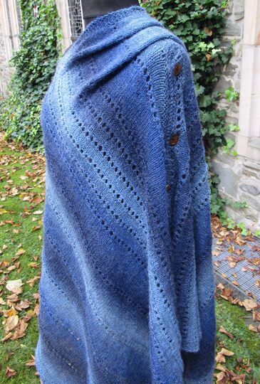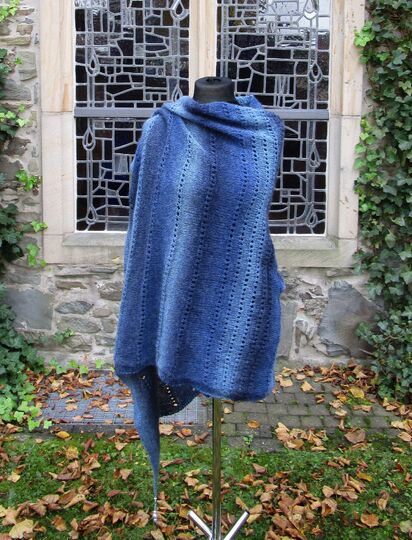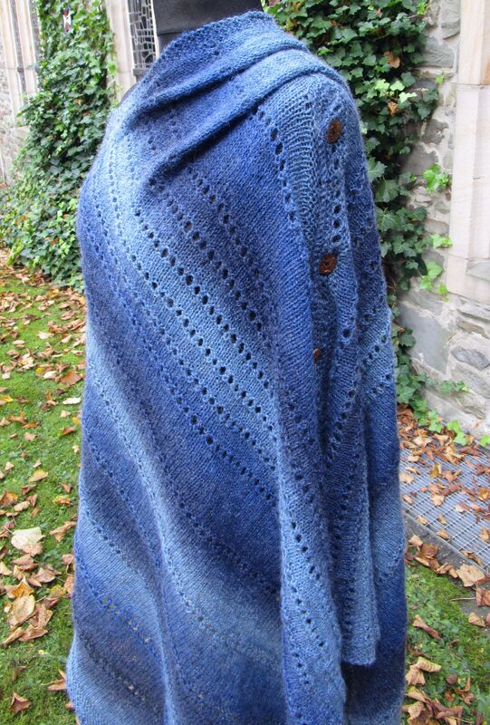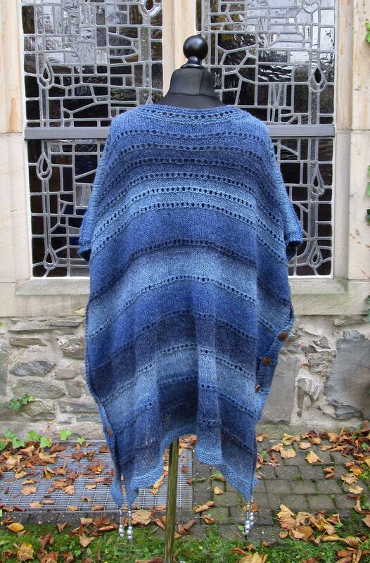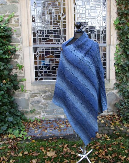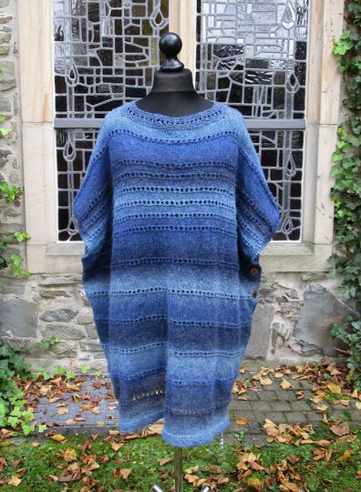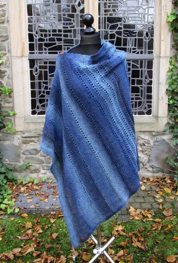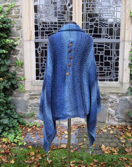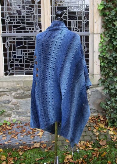 Oder man dreht Versa um 90 Grad, dann hat man einen Ärmelschal. Oder ist es so doch schon ein Bolero? Oder ein lässiger Pulli? Und auch hier kann man die Ärmel so weit zuknöpfen, wie man gerade mag. Und wenn man gerade eine große Stola tragen möchte, knöpft man den Halsausschnitt zu und trägt den Poncho eben quer als Tuch. Wobei man dann dieses Tuch auch wieder vorne zuknöpfen kann.