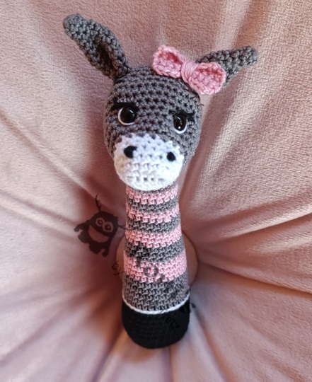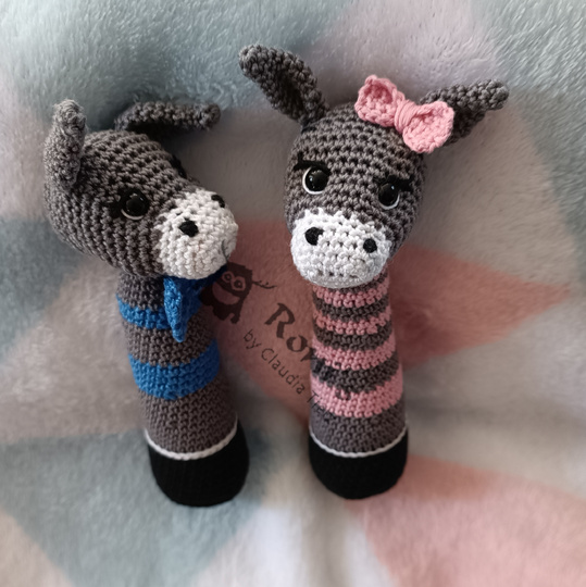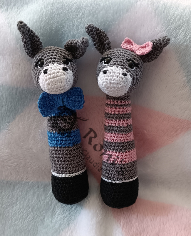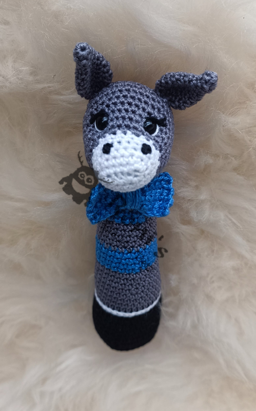 Anleitung in deutscher Sprache zum Häkeln von Esel-Stabrasseln für Babys oder Kleinkinder.