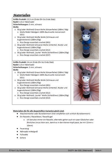 Die Anleitung „Dusty-Der Esel“ bzw. „Dusty the Donkey“ ist Eigentum von “Roni’s by Claudia Tietz” und unterliegt dem Copyright. Das Dokument (einschließlich aller Teilbereiche) darf nach Erwerb ausschließlich für den privaten Gebrauch genutzt werden und darf nicht vervielfältigt, weiterverkauft, weitergegeben, abgedruckt, getauscht, veröffentlicht oder in irgendeiner Form abgewandelt werden. Auch Übersetzungen in andere Sprachen sowie Abwandlungen oder Reproduktion anhand des Bildes mit dem Resultat einer Anleitung die in irgendeiner Form weitergegeben wird ist untersagt.
