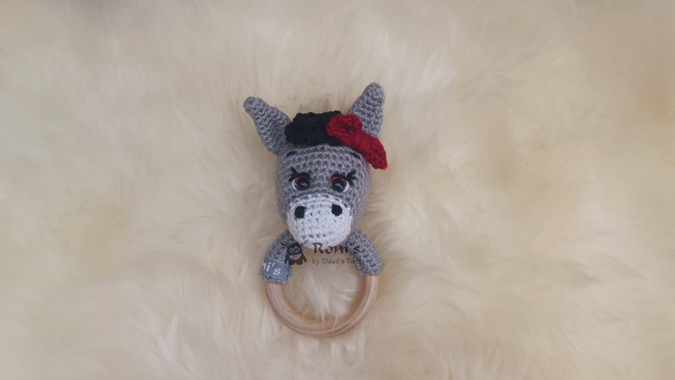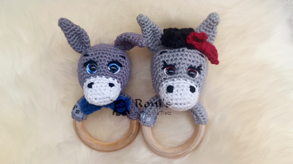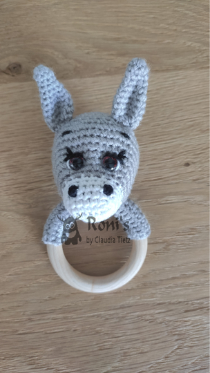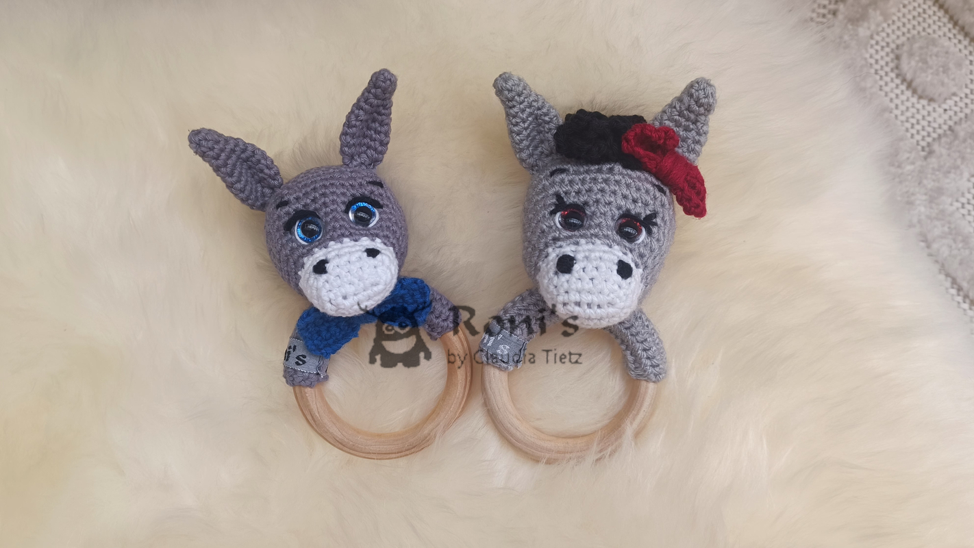 Anleitung in deutscher Sprache zum Häkeln von Esel-Holzringrasseln für Babys oder Kleinkinder.