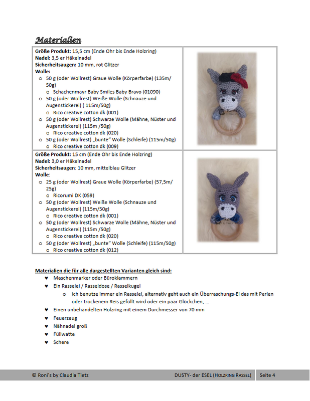 Die Anleitung „Dusty-Der Esel“ bzw. „Dusty the Donkey“ ist Eigentum von “Roni’s by Claudia Tietz” und unterliegt dem Copyright. Das Dokument (einschließlich aller Teilbereiche) darf nach Erwerb ausschließlich für den privaten Gebrauch genutzt werden und darf nicht vervielfältigt, weiterverkauft, weitergegeben, abgedruckt, getauscht, veröffentlicht oder in irgendeiner Form abgewandelt werden. Auch Übersetzungen in andere Sprachen sowie Abwandlungen oder Reproduktion anhand des Bildes mit dem Resultat einer Anleitung die in irgendeiner Form weitergegeben wird ist untersagt.