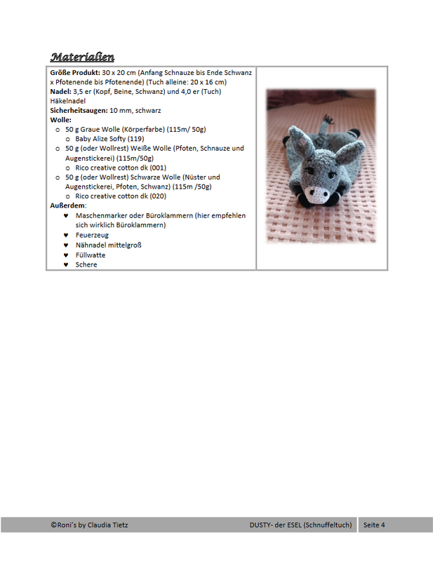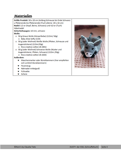 Die Anleitung „Dusty-Der Esel“ bzw. „Dusty the Donkey“ ist Eigentum von “Roni’s by Claudia Tietz” und unterliegt dem Copyright. Das Dokument (einschließlich aller Teilbereiche) darf nach Erwerb ausschließlich für den privaten Gebrauch genutzt werden und darf nicht vervielfältigt, weiterverkauft, weitergegeben, abgedruckt, getauscht, veröffentlicht oder in irgendeiner Form abgewandelt werden. Auch Übersetzungen in andere Sprachen sowie Abwandlungen oder Reproduktion anhand des Bildes mit dem Resultat einer Anleitung die in irgendeiner Form weitergegeben wird ist untersagt.
