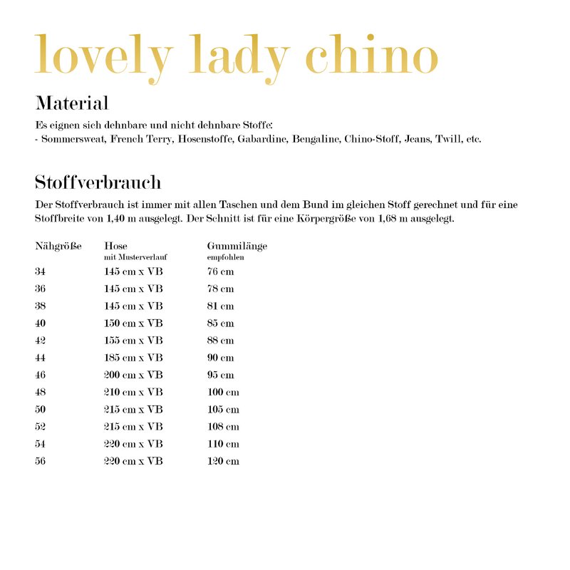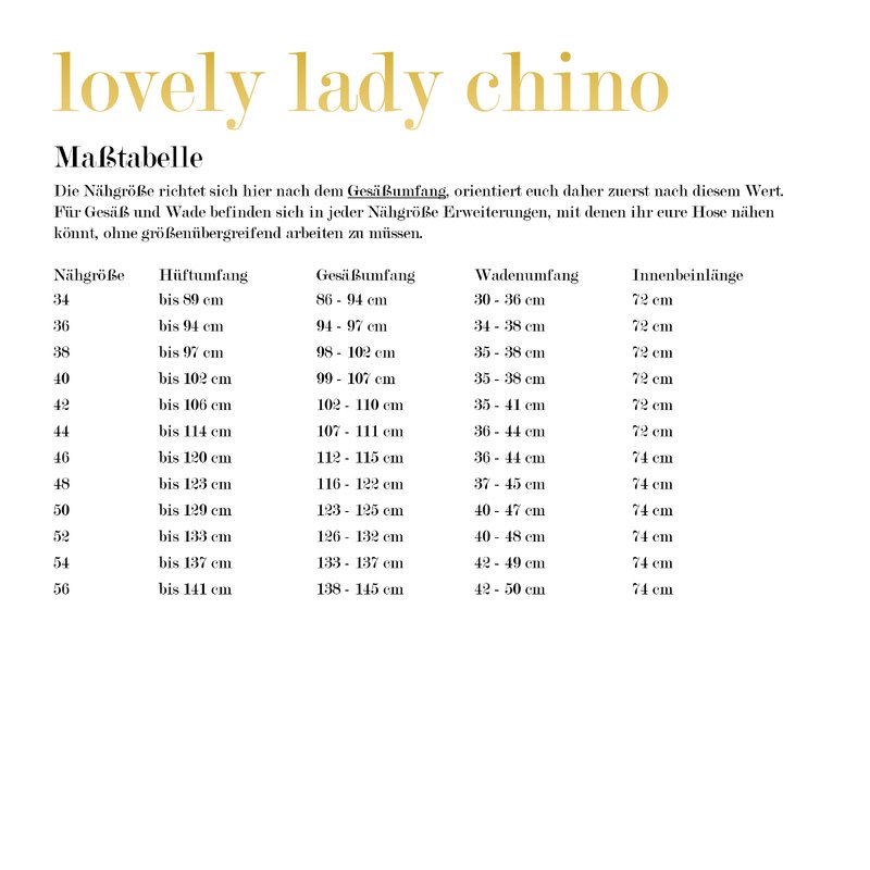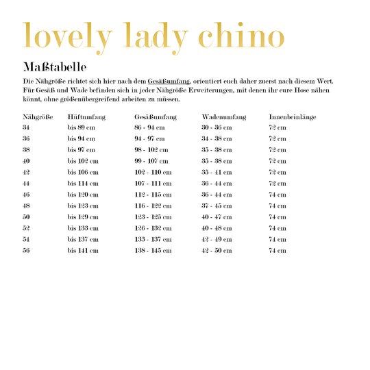 Alle Rechte des ebooks „lovely lady chino“ (bebilderte Anleitung und Schnittmuster) liegen bei Sylvia Bentz. Der Schnitt darf für private Zwecke verwendet werden. Möchtest du genähte Einzelstücke verkaufen, erwerbe dafür die Gewerbelizenz unter kontakt@lovelysewdesign.de