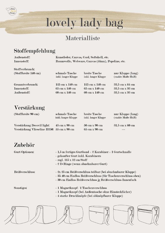 lovely lady bag ist eine elegante, aber auch sportliche Alltagstasche, die mit verschiedenen Varianten ganz individuell genäht werden kann. Durch die sehr ausführliche Anleitung in Bild und Text, kann die Tasche auch als Nähanfänger genäht werden.