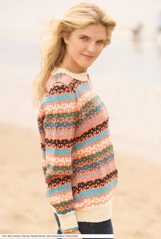 Dieser Jacquard-Pullover mit Rippenbündchen begeistert nicht nur durch sein weiches, kuscheliges Material aus reiner Schurwolle, sondern hier steht vor allem das Zusammenspiel von sechs Farbtönen im Mittelpunkt. Die Farben ergänzen sich stilvoll und sorgen für eine abwechslungsreiche Optik. Die Ärmel werden mit Armkugel gearbeitet, was eine besonders gute Passform an den Schultern ergibt. Für das einfache Jacquardmuster gibt es ein Zählmuster. Alle Bündchen und die Ausschnittblende sind im 2/2-Rippenmuster gearbeitet. Eine Anleitung steht für die Größen 38/40, 42/44 und 46 bereit.