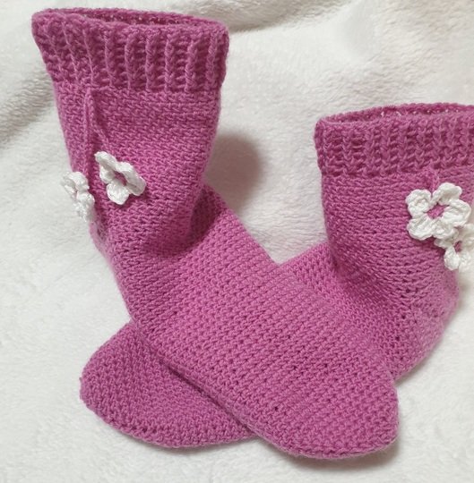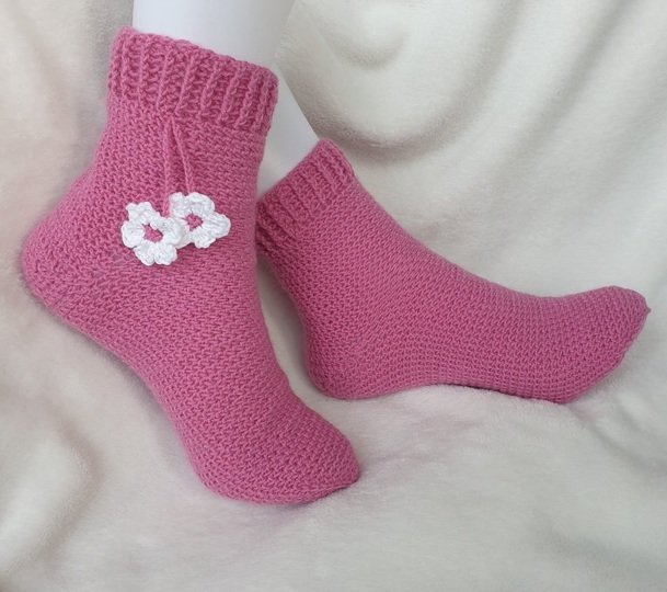Diese Socken können sowohl mit leichtem Baumwollgarn für z.B. sommerliche Söckchen oder mit dickem Garn für eine flauschige Fußbekleidung gehäkelt werden.