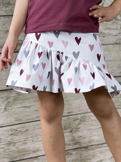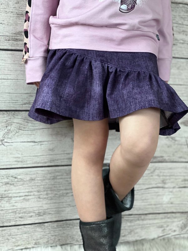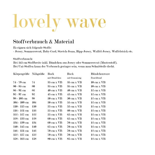 lovely wave ist ein lässig geschnittener Rock, den Mädchen vom Laufalter bis ins Teenager-Alter (Größe 74-158) über das ganze Jahr tragen können. Er kann aus unterschiedlichen Stoffarten genäht werden.