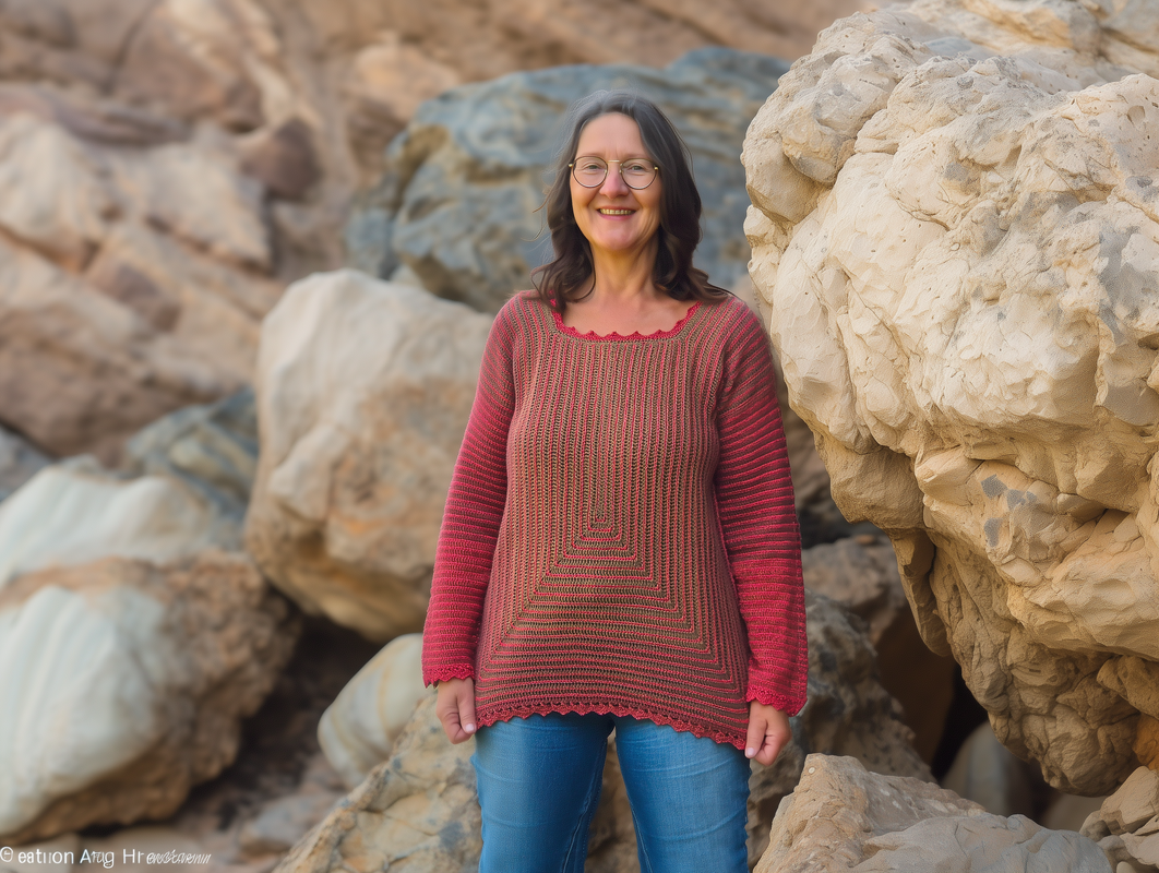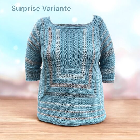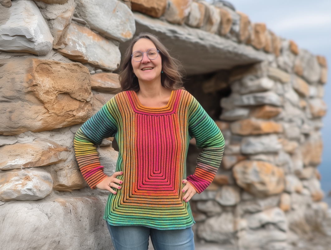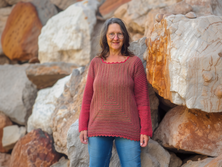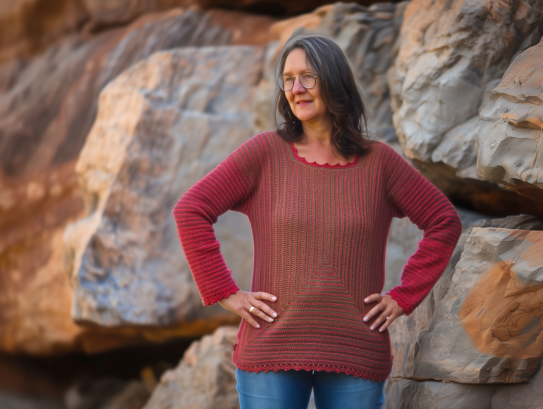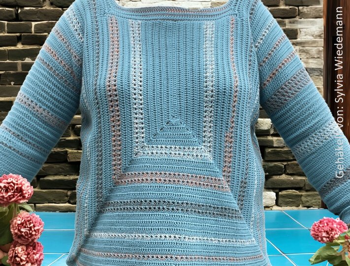 StrukturWunder ist ein anpassbarer Häkelpullover, der ausschließlich mit Stäbchen und festen Maschen gearbeitet wird.