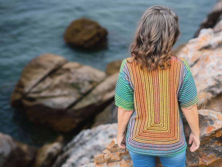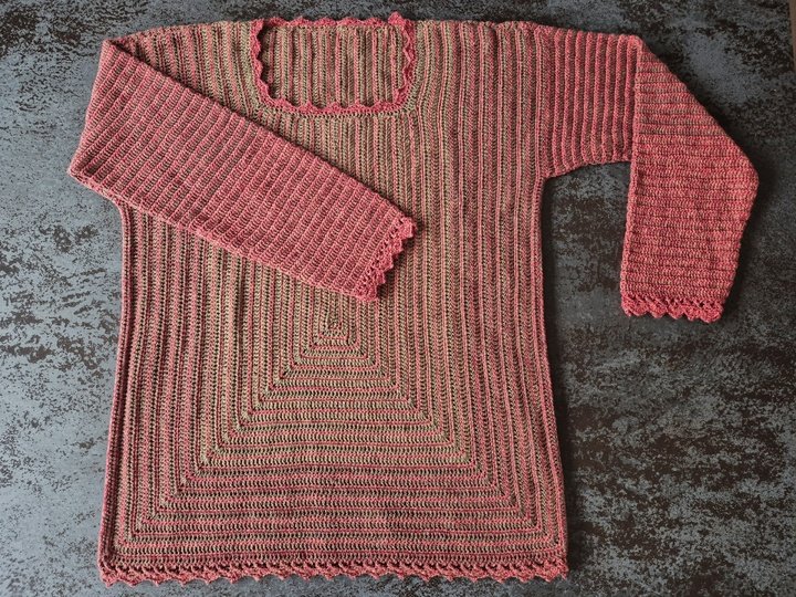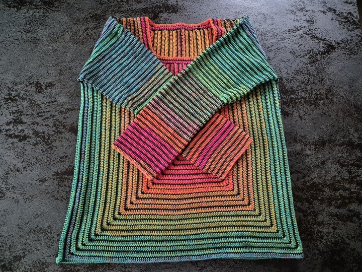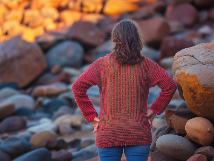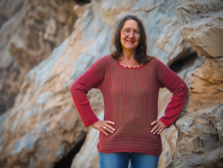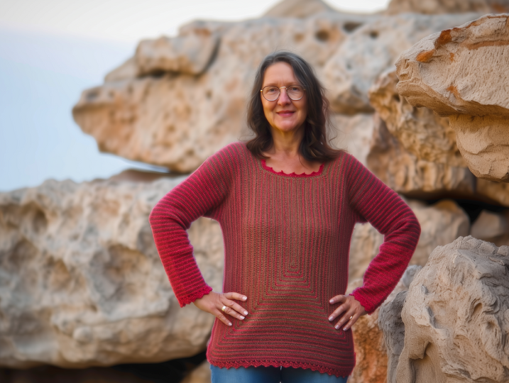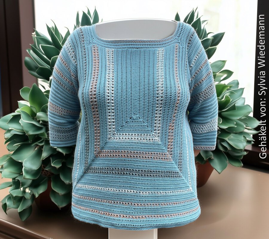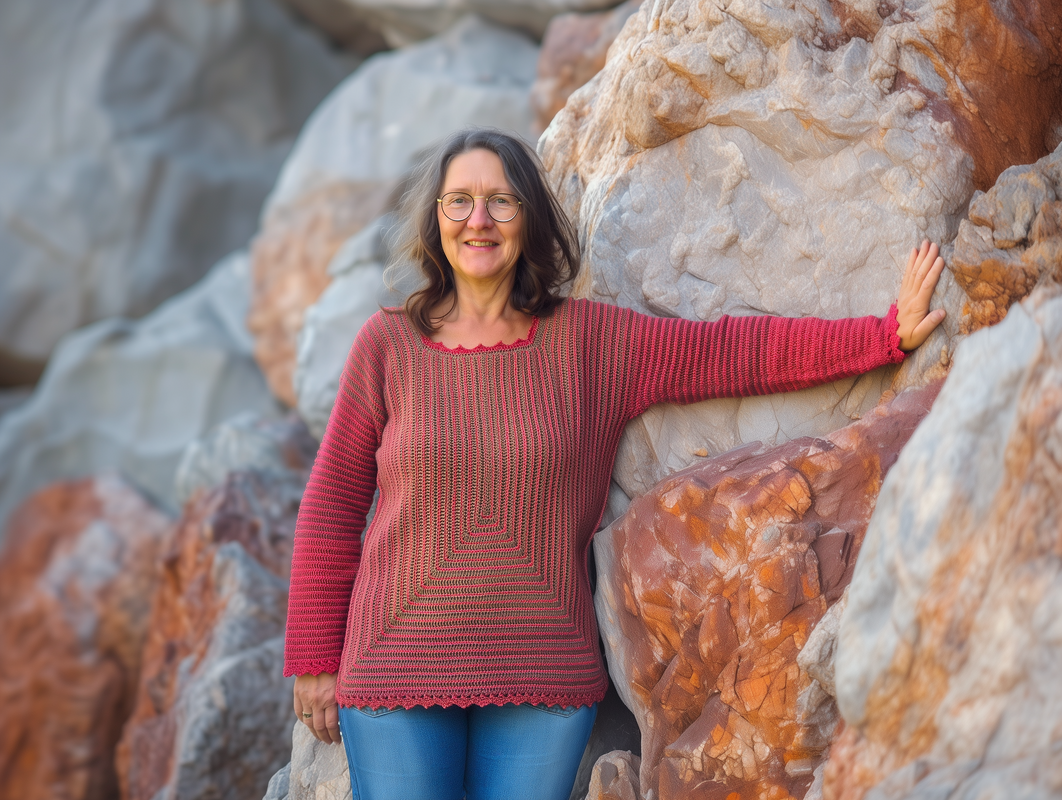 StrukturWunder ist ein anpassbarer Häkelpullover, der ausschließlich mit Stäbchen und festen Maschen gearbeitet wird.