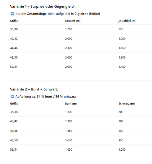 Größe – Gesamt (m) – je Bobbel (m)