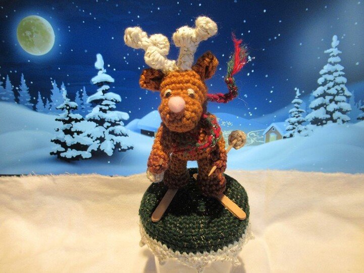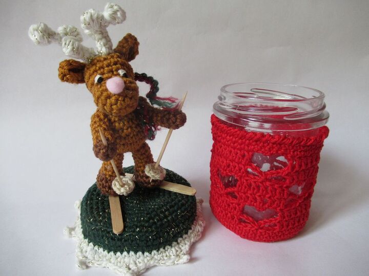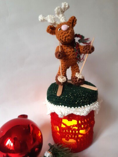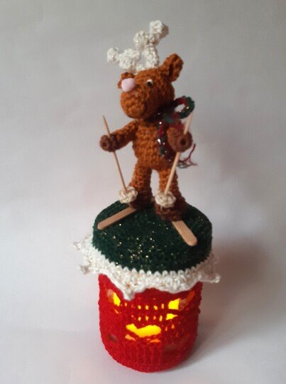 Der Elch wird etwa 11 cm groß. Das verwendete Glas hat einen Durchmesser von 6 cm un eine Höhe von 7 cm. In der Anleitung wird aber ausgeführt, wie du das Muster an andere Größen anpassen kannst.