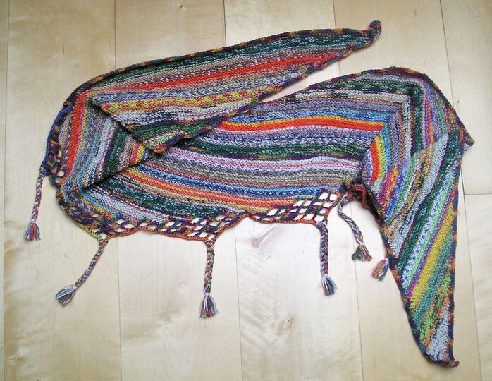 Anleitung zum Stricken des Schals "Schrägstreifen" aus lauter Resten 4-fädiger Sockenwolle mit Häkelkante und geflochtenen Zöpfen.
