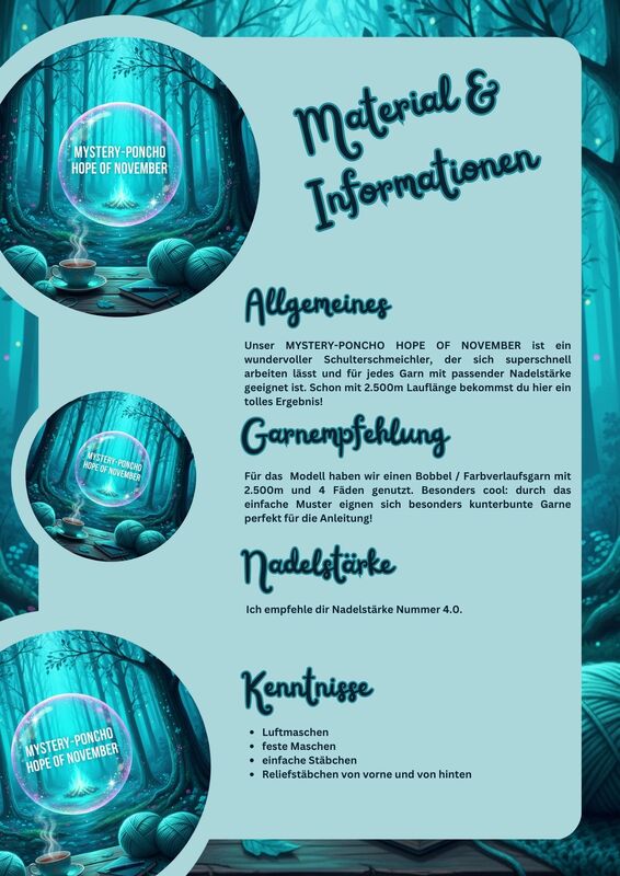 Um den „Hope of November“ – Mystery-Poncho nacharbeiten zu können, solltest du einige grundlegende Häkeltechniken sicher beherrschen. Die Anleitung ist so aufgebaut, dass sie gut verständlich bleibt, aber ein wenig Erfahrung im Häkeln voraussetzt.