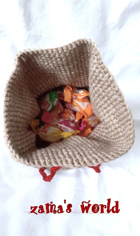Im Inneren des Sacks haben gut und gerne 2 Tüten Bonbons in handelsüblicher Größe oder ein kleines Geschenk Platz.