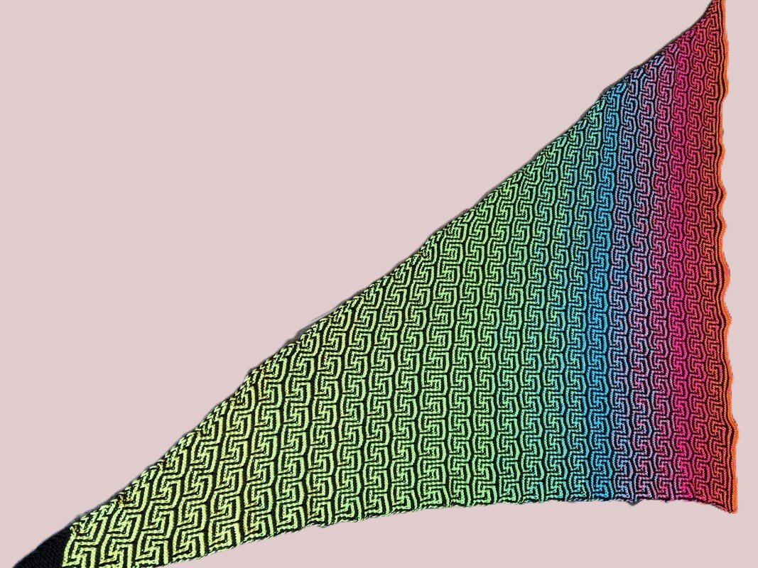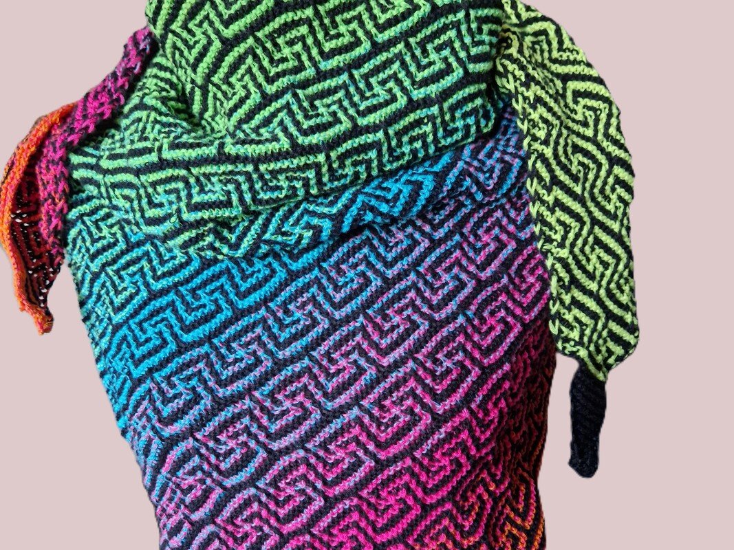 Du bekommst eine Strickanleitung für ein asymmetrisches Dreieckstuch, welches mit 2 kontrastreichen Bobbeln mit Hebemaschen gestrickt wird.