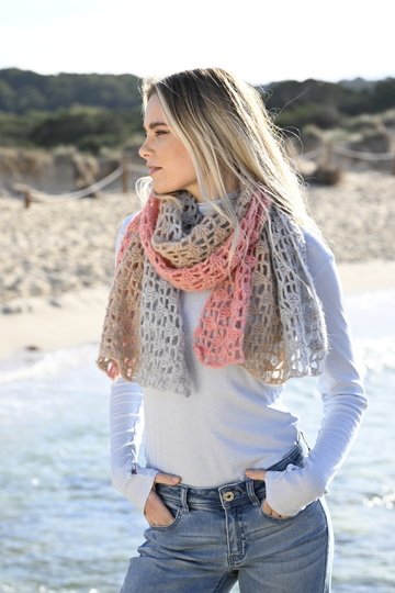 Anfängerleichter, dreifarbiger Häkelschal. Nach einer übersichtlichen Häkelschrift werden nur Luftmaschen und Stäbchen gearbeitet.