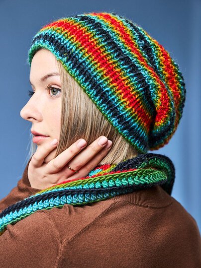 Bring Farbe in die kalte Jahreszeit! Das Set Diana aus Mütze und Kragenschal strahlt mit seinem fröhlichen Streifenmuster pure Lebensfreude aus.