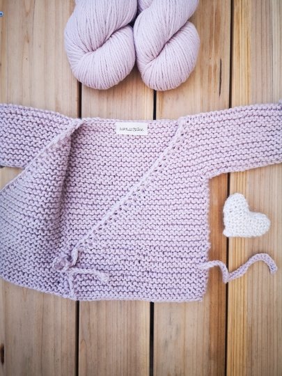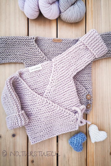 Die Baby Wickeljacke wird kraus rechts in einem Stück gestrickt und mit Bändchen oder Knöpfen geschlossen. Beide Varianten sind in der Anleitung erklärt.