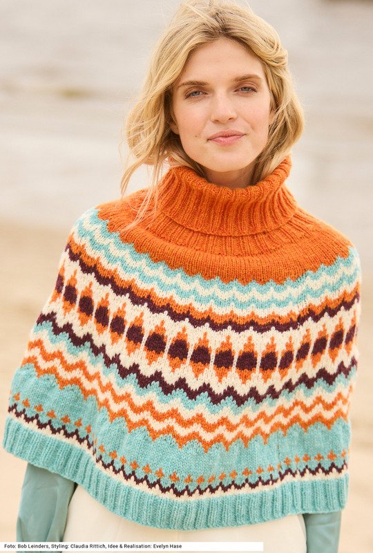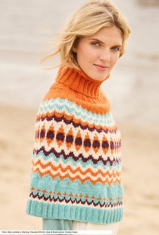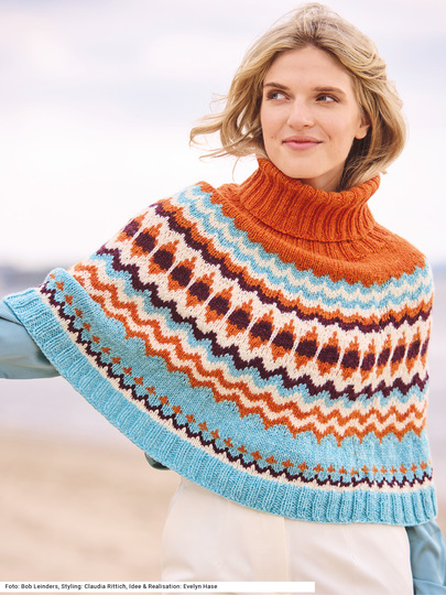 Diese Pelerine gibt nordischem Flair eine moderne Interpretation: Das klassische Jacquardmuster wird in vier lebendigen, angesagten Farben gearbeitet und mit einem voluminösen Rollkragen kombiniert. In Runden von oben nach unten gestrickt, entsteht ein harmonischer Farbverlauf, der das detailreiche Muster unterstreicht. Das leichte Kettengarn aus Merinowolle mit etwas Polyamid-Beimischung sorgt für angenehmen Tragekomfort bei maximaler Wärme. Ob über Mantel, Bluse oder Pullover – dieses Modell eignet sich hervorragend für Layering-Looks. Die Anleitung dazu gibt es für die Größen 36 – 40 und 42 – 46 sowie 48/50.