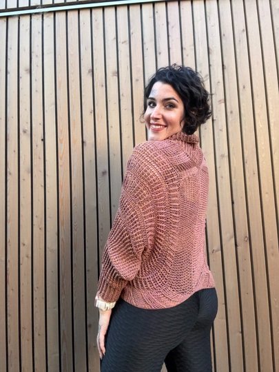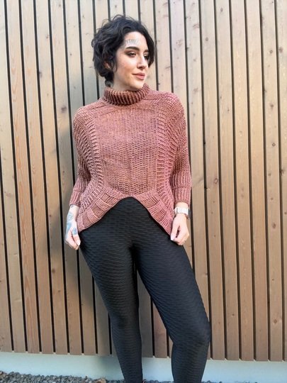 Das abgebildete Modell trägt die Konfektionsgröße 44/46. Diese Größe passt wunderbar und zeigt, wie bequem und schmeichelhaft der „Glamour Girl“-Pullover sitzt.