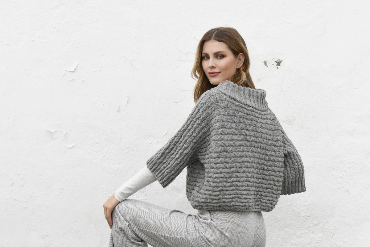 Der Kurzpullover mit 3/4 Ärmel wird in einem Stück quer gestrickt.