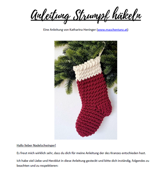 Mit dieser anfängerfreundlichen Anleitung häkelst du einen schönen Weihnachtsstrumpf, der nur darauf wartet, mit Köstlichkeiten gefüllt zu werden! Auf fünf Seiten wird jeder Arbeitsschritt mit Bildern und detaillierter Erklärung veranschaulicht. Nach dem Kauf erhältst du den digitalen Download als E-Mail. Da die E-Mail manuell von mir generiert wird, kann es zu Verzögerungen im Versand kommen.