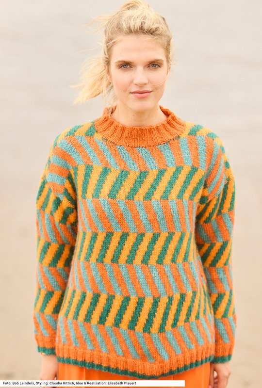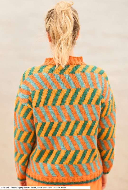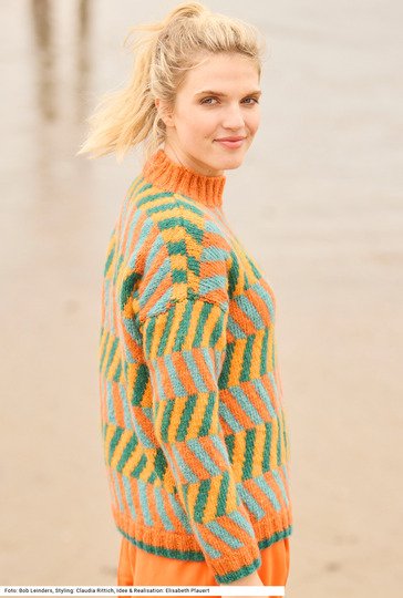 Der bequem geschnittene, kuschelig warme Pullover mit Stehkragen begeistert mit seinen vier harmonisch aufeinander abgestimmten Farbtönen. Das prachtvolle Jacquardmuster mit diagonaler Optik bringt Schwung in die Garderobe und macht das Modell zu einem Hingucker. Zweifarbige Bündchen und die einfarbige Ausschnittblende sind im Rippenmuster gearbeitet. Die Ärmel enden ganz gerade, was das Einnähen erleichter und überfallende Schultern ergibt. Das voluminöse Garn mit leichtem Flausch besteht aus Baby-Alpaka, Baumwolle und Schurwolle und ist in vielen Farben erhältlich. Eine Anleitung steht für die Größen 38/40, 42/44 und 46/48 bereit.
