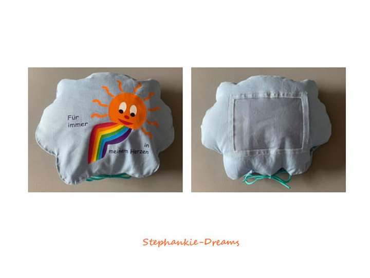 Manchmal verliert man einen geliebten Menschen, oder man hat einen geliebten Menschen nicht so nah bei sich, wie man es gerne hätte. Um den Schmerz ein wenig erträglicher zu machen, schaut man sich gerne Fotos von diesem Menschen an. Das Erinnerungskissen Herz, Wolke und Stern ist perfekt, um darin ein Foto