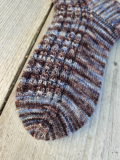 Das charakteristische Kaffeebohnenmuster verleiht dem Fußrücken eine feine Struktur, während die Sohle im klassischen Rippenmuster gearbeitet wird – für eine perfekte Mischung aus Komfort und Eleganz.
