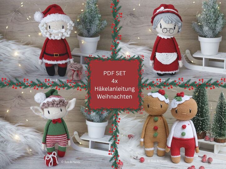 4x Häkelanleitung SET "Mr Claus und seine fleißigen Helfer - Weihnachtsmann, Weihnachtsfrau, Weihnachtself Phil & Lebkuchenmännchen Leo“