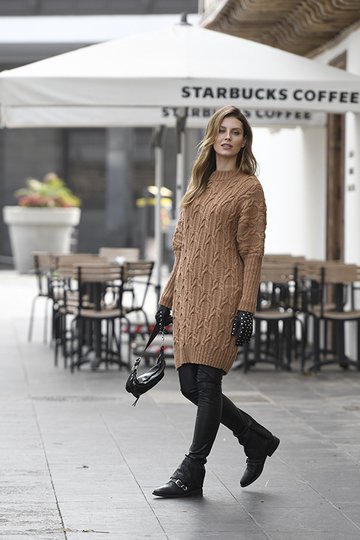 Ein ausdrucksstarkes Flechtmuster und hohe Ärmelbündchen vervollständigen die schlanke Form. Mit eingearbeiteten Taschen.