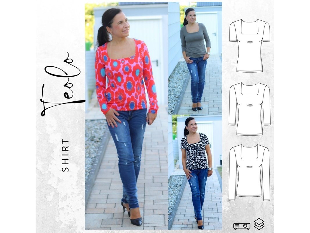 Mit dem Schnittmuster Shirt TELO nähst du dir ein zeitloses Basic, das in keinem Kleiderschrank fehlen darf! Der moderne eckige Ausschnitt verleiht dem Shirt einen eleganten Look, während die verschiedenen Längen und Ärmelvarianten für jede Jahreszeit und Figur die passende Option bieten.
