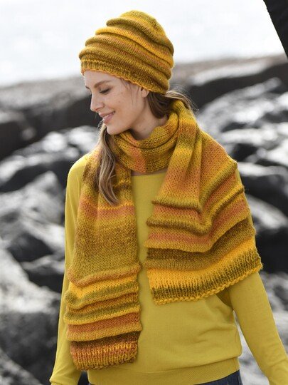 für den Schal Stricknadeln Nr. 7 und 8, für die Mütze ein Nadelspiel Nr. 6 und 7