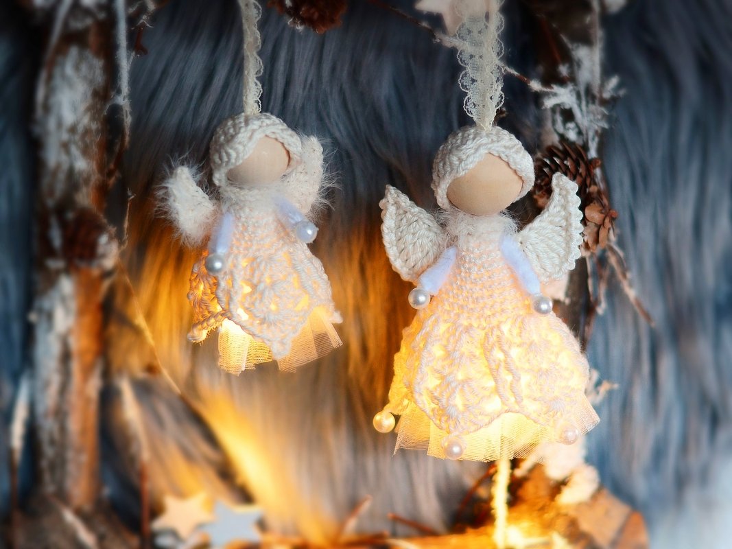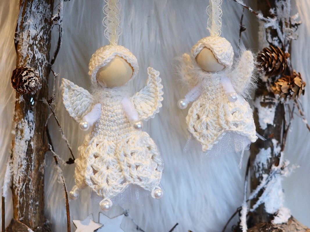 Mit der angegebenen Wolle wird der große Engel ca. 10 cm groß, der kleine Engel ca. 8 cm.