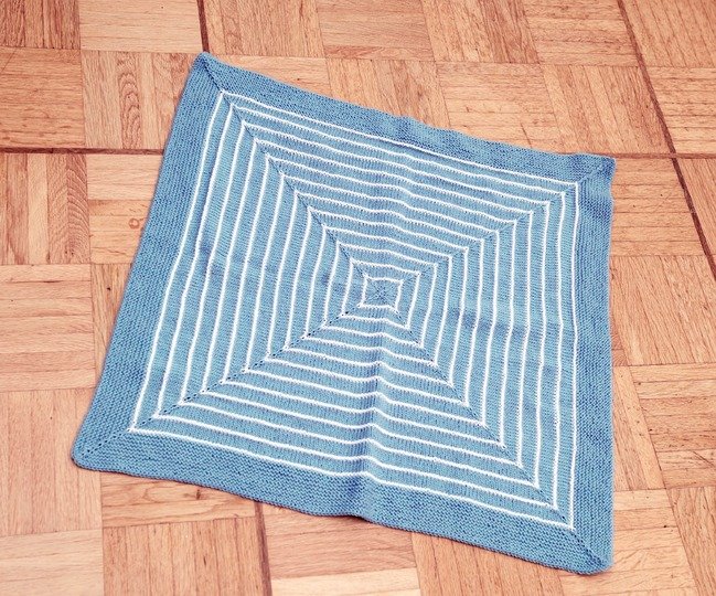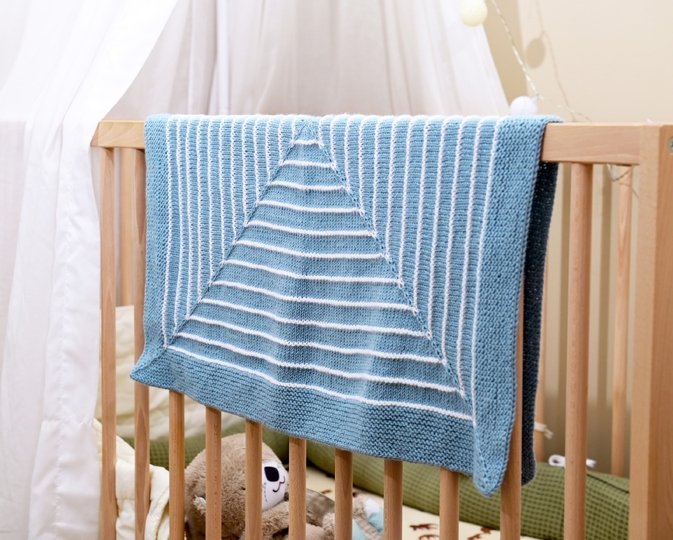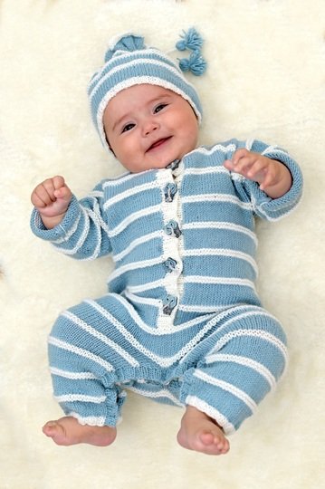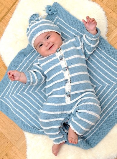 Strickanleitung für ein Baby-Set bestehend aus einem gestreiften Overall mit passender Mütze und Babydecke dazu.