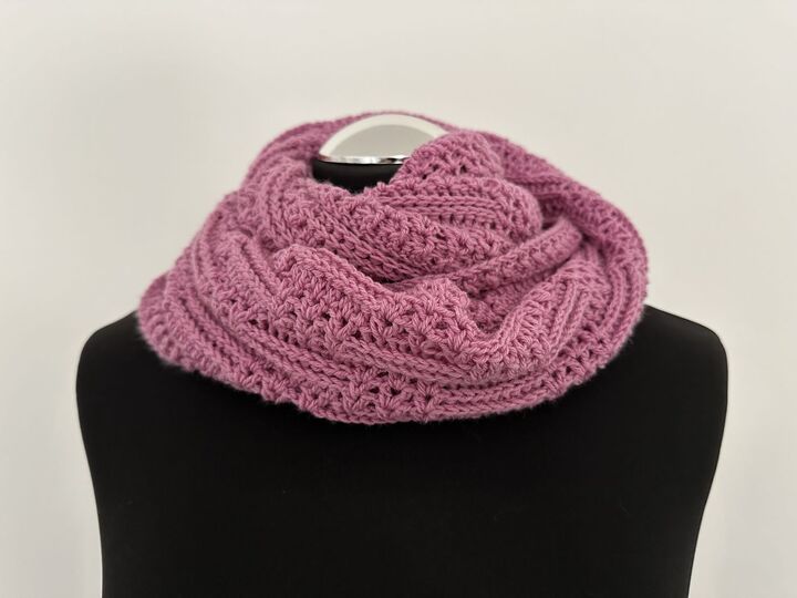 Unter Verwendung des angegebenen Garns wird dieser Loop ca. 24 cm breit und hat einen Umfang von ca. 94 cm.