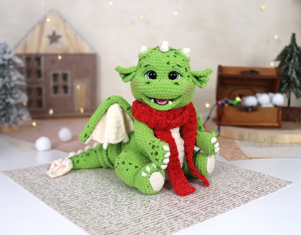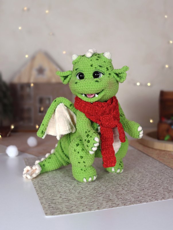 Die beiden Drachen werden aus weicher Chenille-Wolle gehäkelt und sind etwa 25 cm groß. Je nach verwendeter Wollstärke und Häkelnadel kann die Größe leicht variieren – mit dünnerer Wolle wird der Drache kleiner, mit dickerer entsprechend größer. Man kann jede beliebige Wolle verwenden, achtet dabei jedoch auf die passende Nadelstärke und Menge. Der Kopf ist mit Gelenkscheiben am Körper befestigt und dadurch in