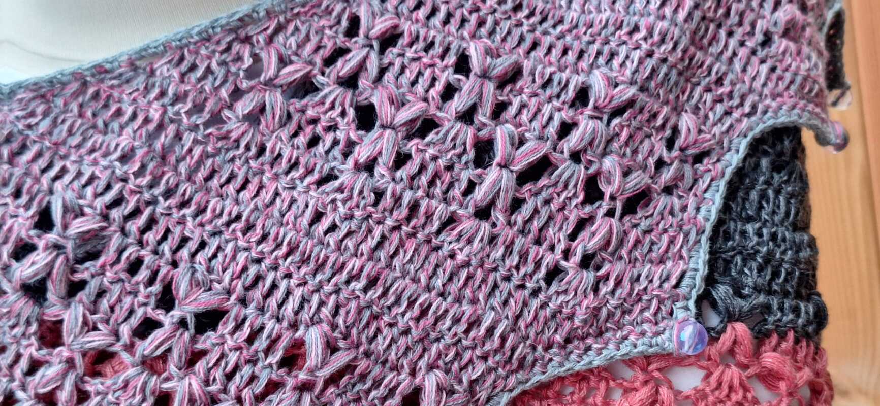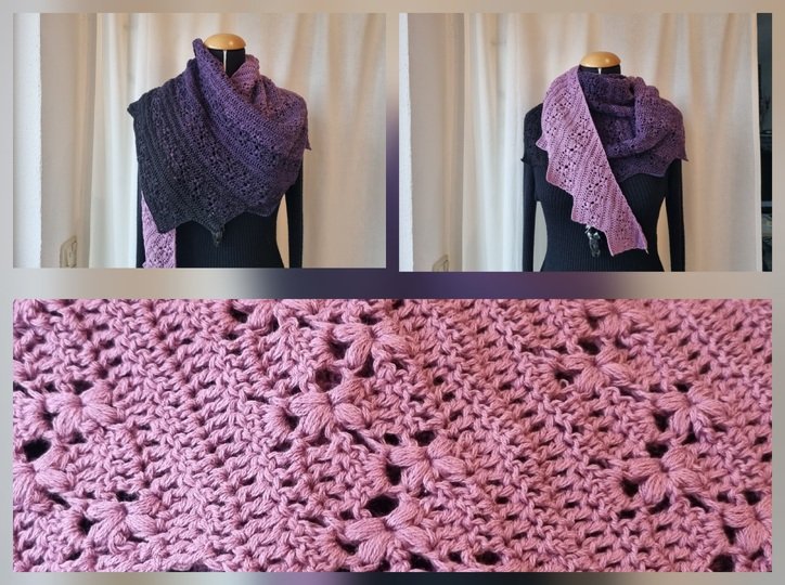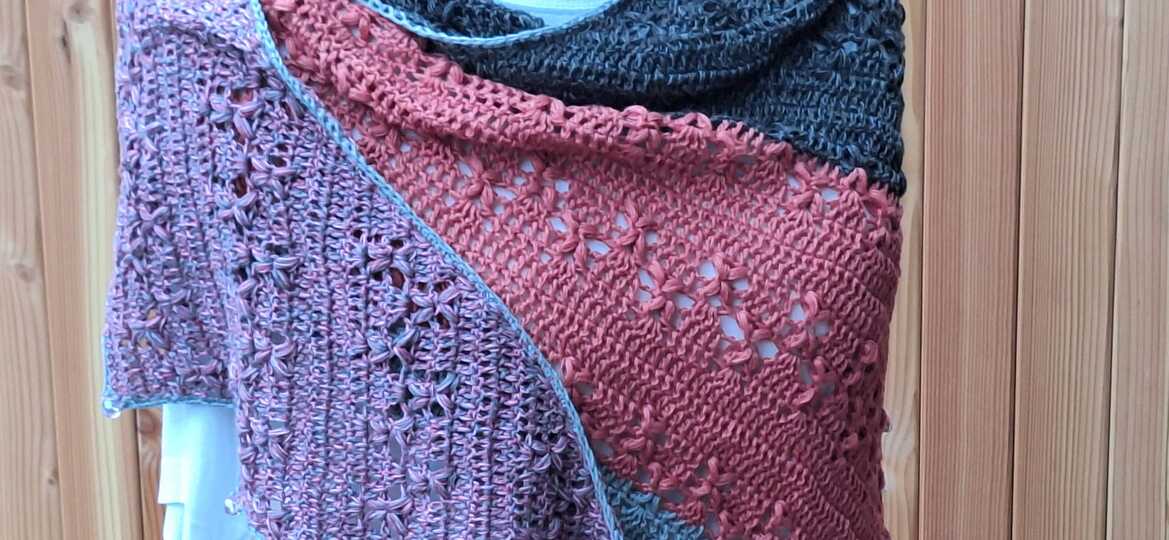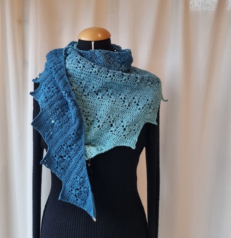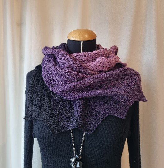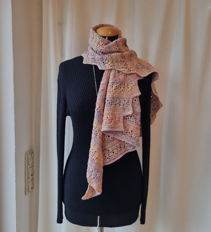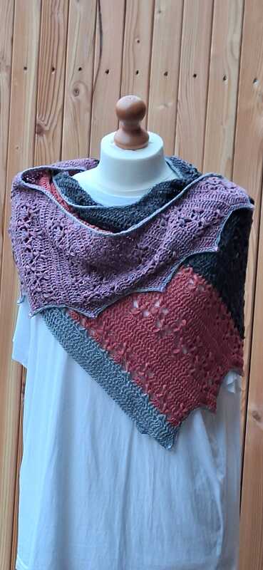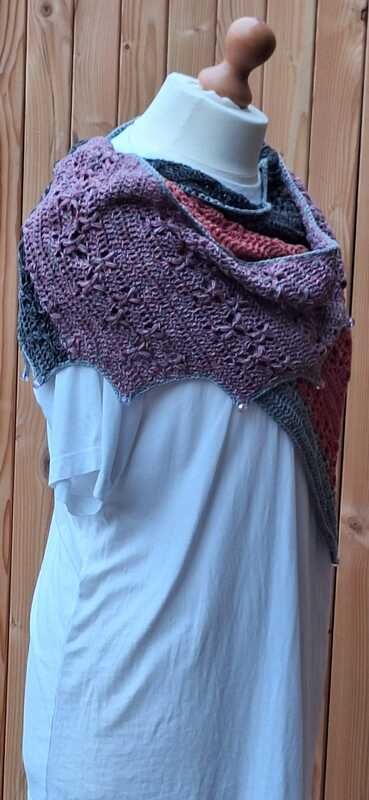 Testgehäkelt mit einem selbstgewickelten, 4-fädigen Bobbel der Testhäklerin mit Nadelstärke 2,5 ergab einen tollen, individuellen Drachenschal mit den Maßen 180x80cm.