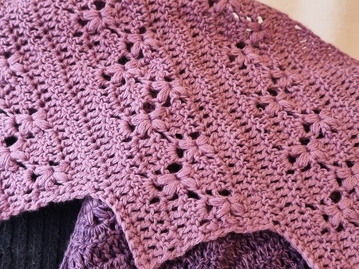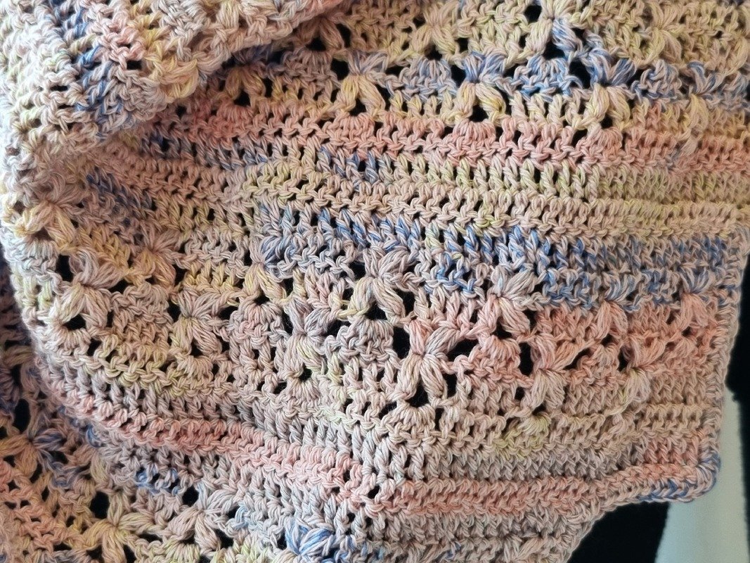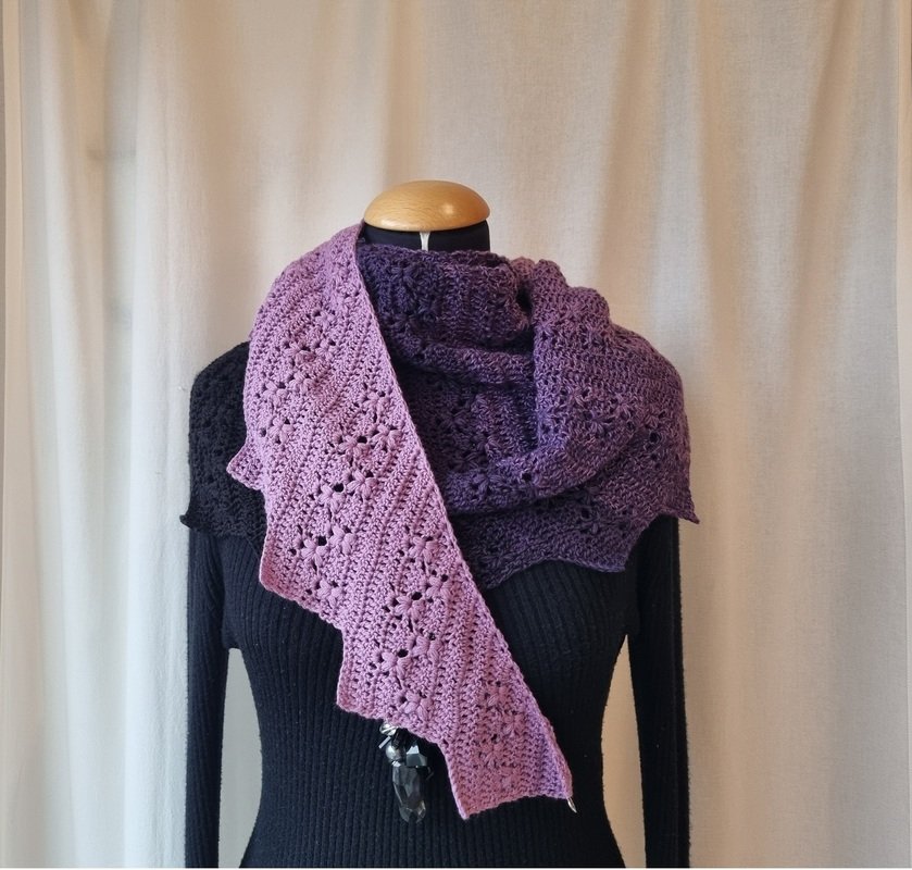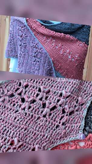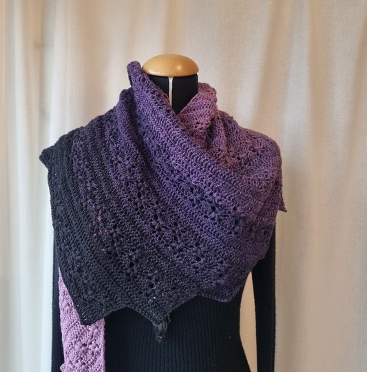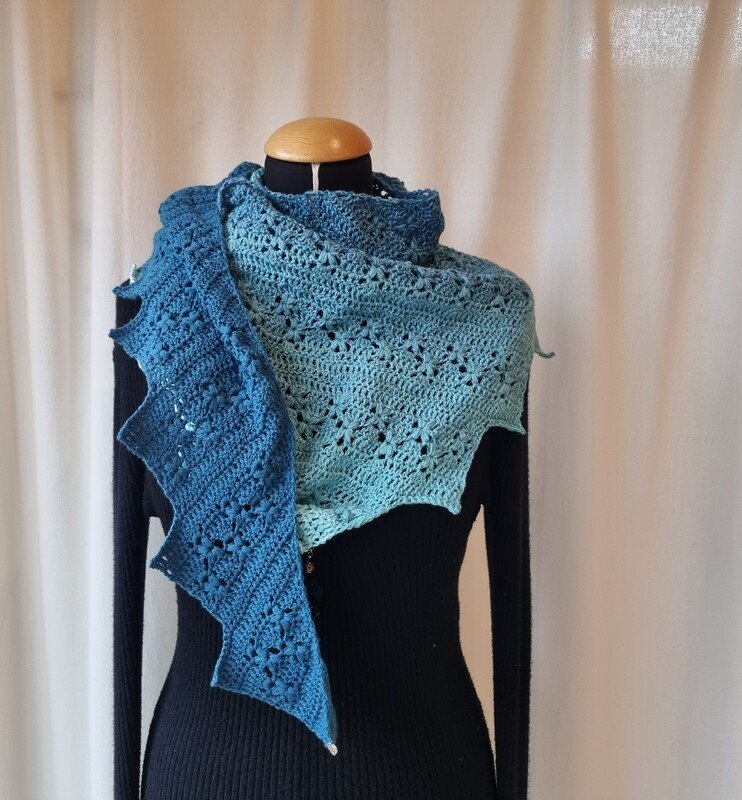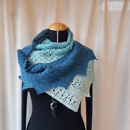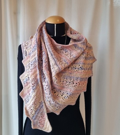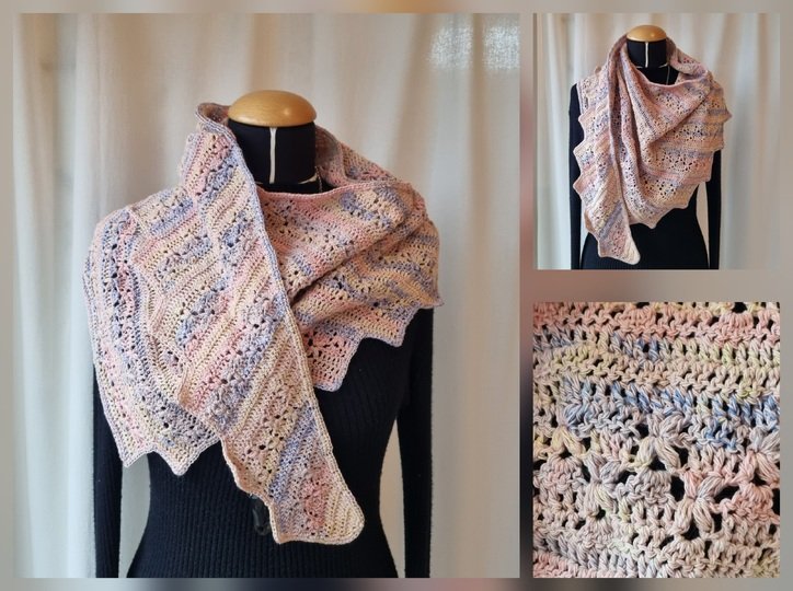 Testgehäkelt mit einem selbstgewickelten, 4-fädigen Bobbel der Testhäklerin mit Nadelstärke 2,5 ergab einen tollen, individuellen Drachenschal mit den Maßen 180x80cm.