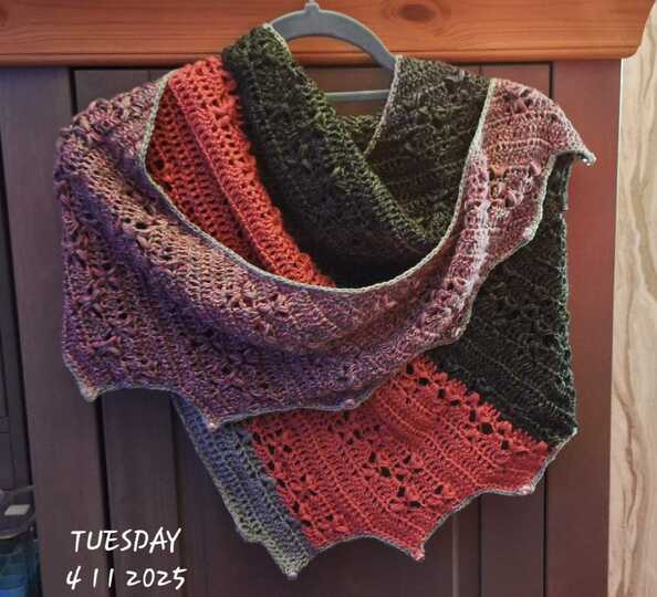 Farbverlaufsgarn 3-fädig, 800m/200g, Nadelstärke 3,0 von DeiDei´s Bobbleplanet ergab einen Drachenschal mit den Maßen 148x64