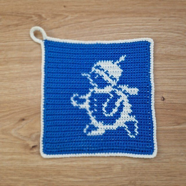 Mit der von mir verwendeten Wolle hat der Topflappen eine Größe von ca 20cm x 20cm