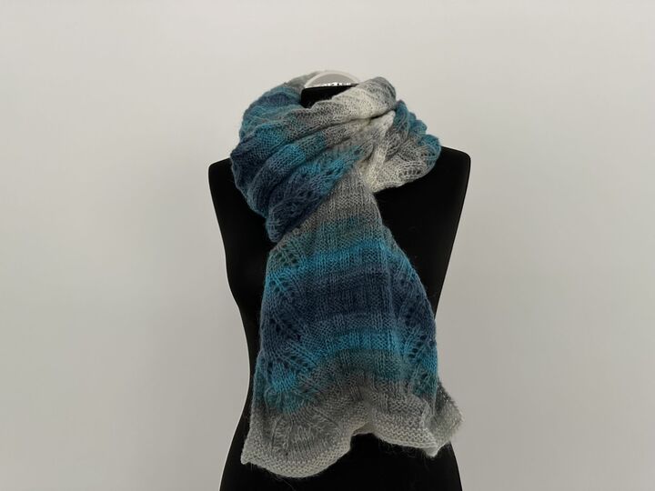 Für die Leichtigkeit sorgt nicht nur das verwendete Garn, sondern auch das Ajourmuster, das bei diesem Schal gearbeitet wird.