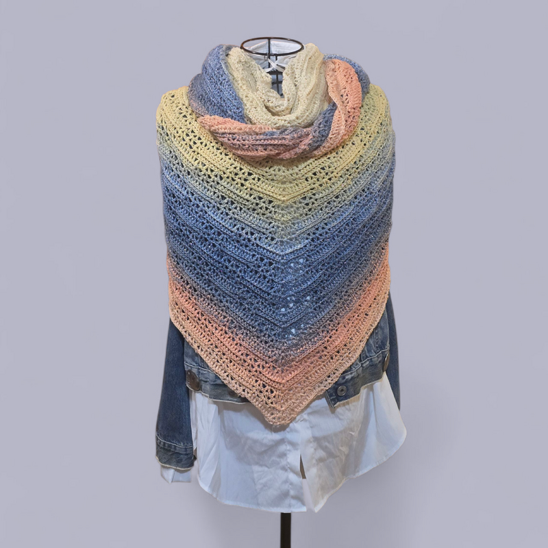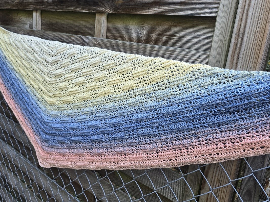 Das Adventstuch 2025 ist ein flaches Dreieckstuch mit einem eingängigen, sich wiederholenden Muster, das schon nach wenigen Reihen richtig Spaß macht. Perfekt, wenn du beim Fernsehen gemütlich vor dich hin häkeln oder unterwegs ein unkompliziertes Projekt dabeihaben möchtest.