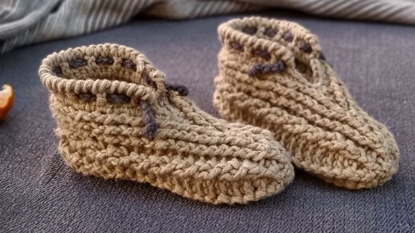 Hausschuhe, von der Ferse bis zur Spitze in einem nahtlosen Stück gehäkelt.