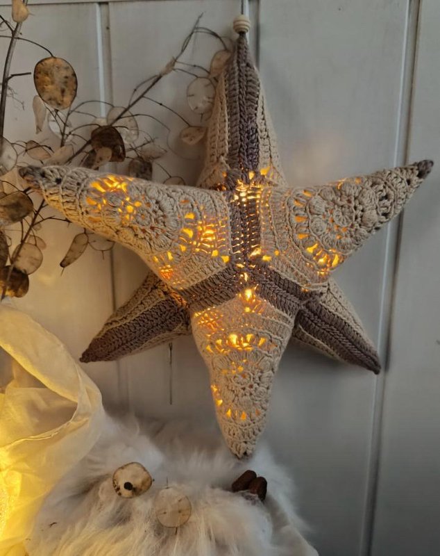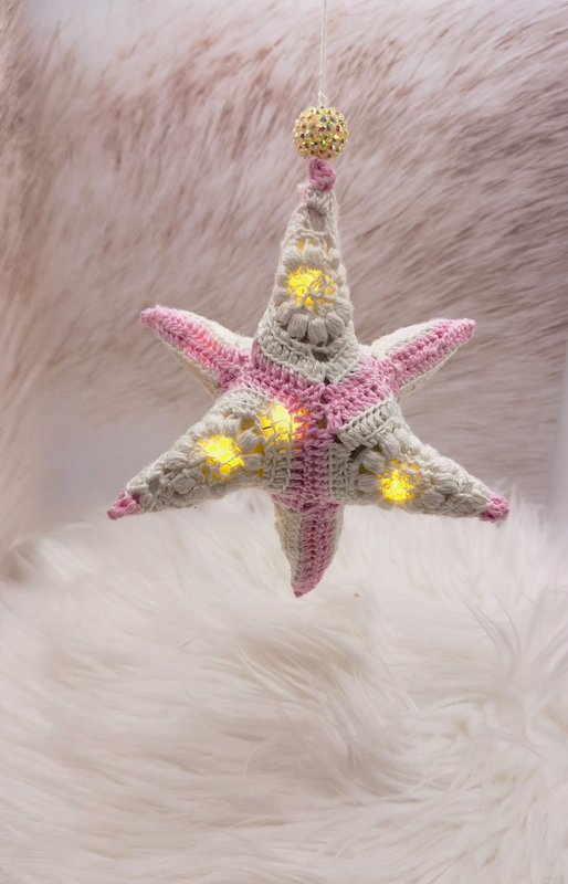 Der Stern wird komplett aus Granny Squares gehäkelt . Das ganze Geheimnis des Sterns besteht im Zusammennähen der einzelnen Grannys.