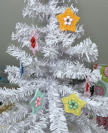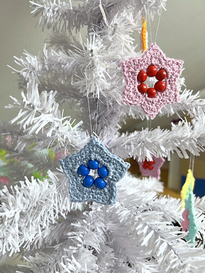 Die Anleitung beschreibt Schritt für Schritt, wie du die Perlen auf das Garn auffädelst, den Ring schließt und die Sterne darum herum häkelst. Beide Varianten – 5-zackiger und 6-zackiger Stern – werden erklärt. Alle verwendeten Abkürzungen sind übersichtlich aufgeführt. Außerdem findest du eine genaue Beschreibung, wie die kleine Sternspitze entsteht und wie du deine Sterne so festigst, dass sie dauerhaft formstabil bleiben, ohne ihre schöne Maschenstruktur zu verlieren.