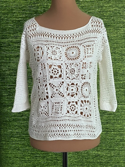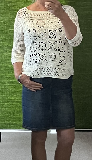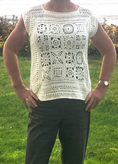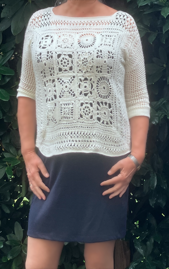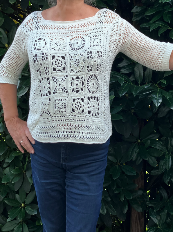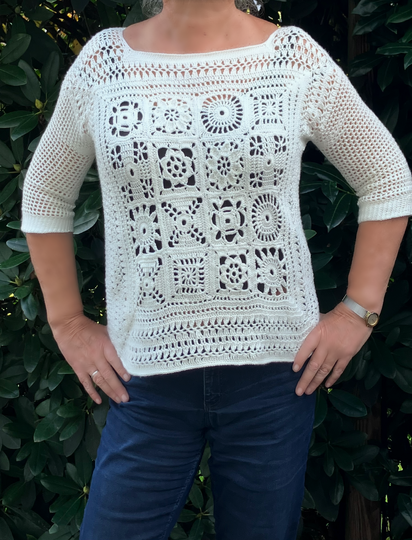 Dieses Shirt lenkt den Blick auf die 16 Grannys, die so angeordnet sind, dass sich immer zwei gleichen – wie beim Spiel „Memory“. Das Häkeln war sehr kurzweilig, obwohl es mit Nadelstärke 2,5 gehäkelt ist. Es geht schneller von der Hand als man denkt. Ich zeige auch eine Alternative zum Rückenteil, die schneller und einfacher zu häkeln ist als das Vorderteil. Das Shirt lässt sich gut mit oder ohne Ärmel tragen.