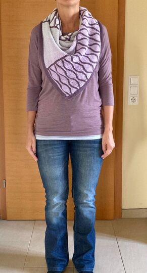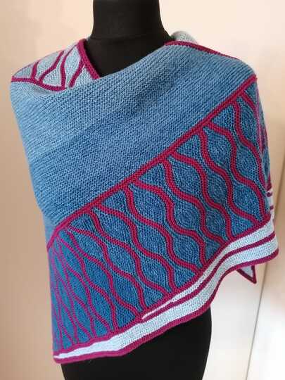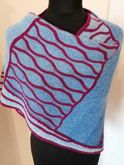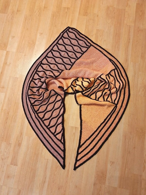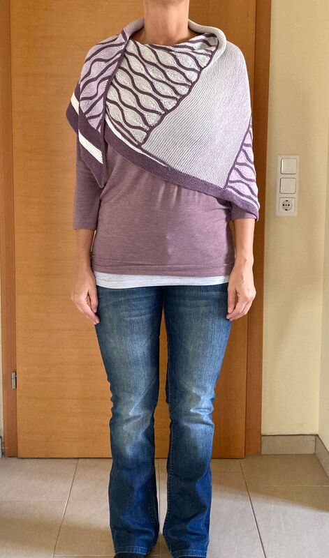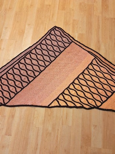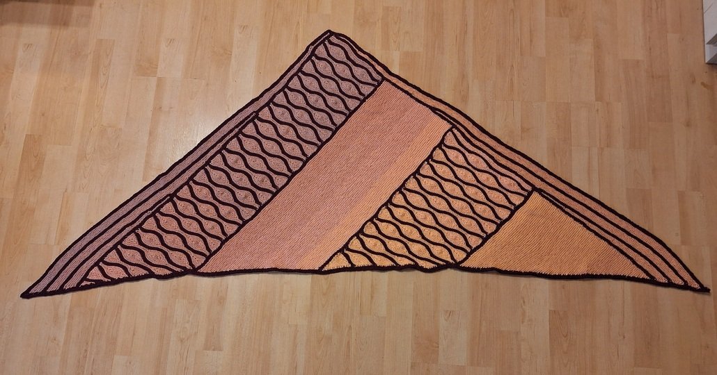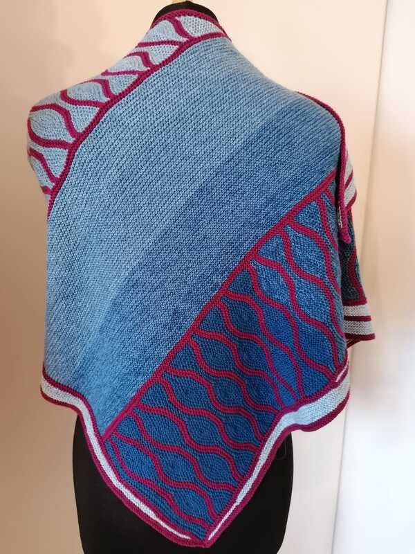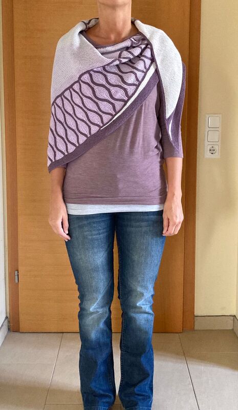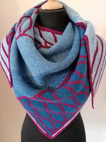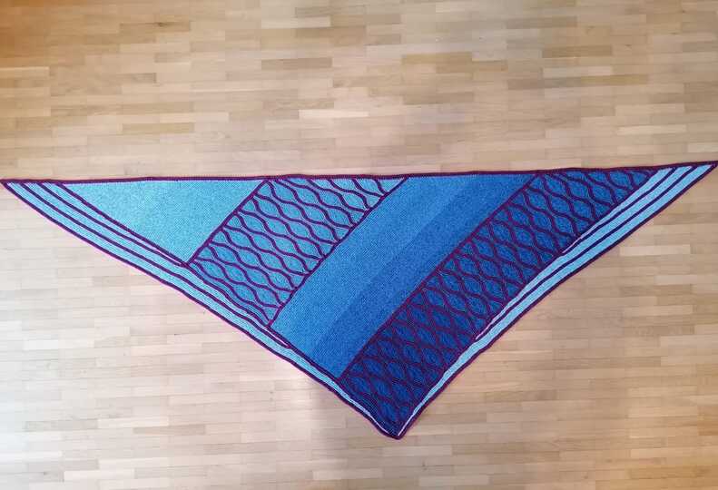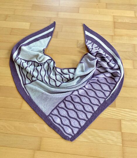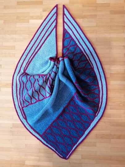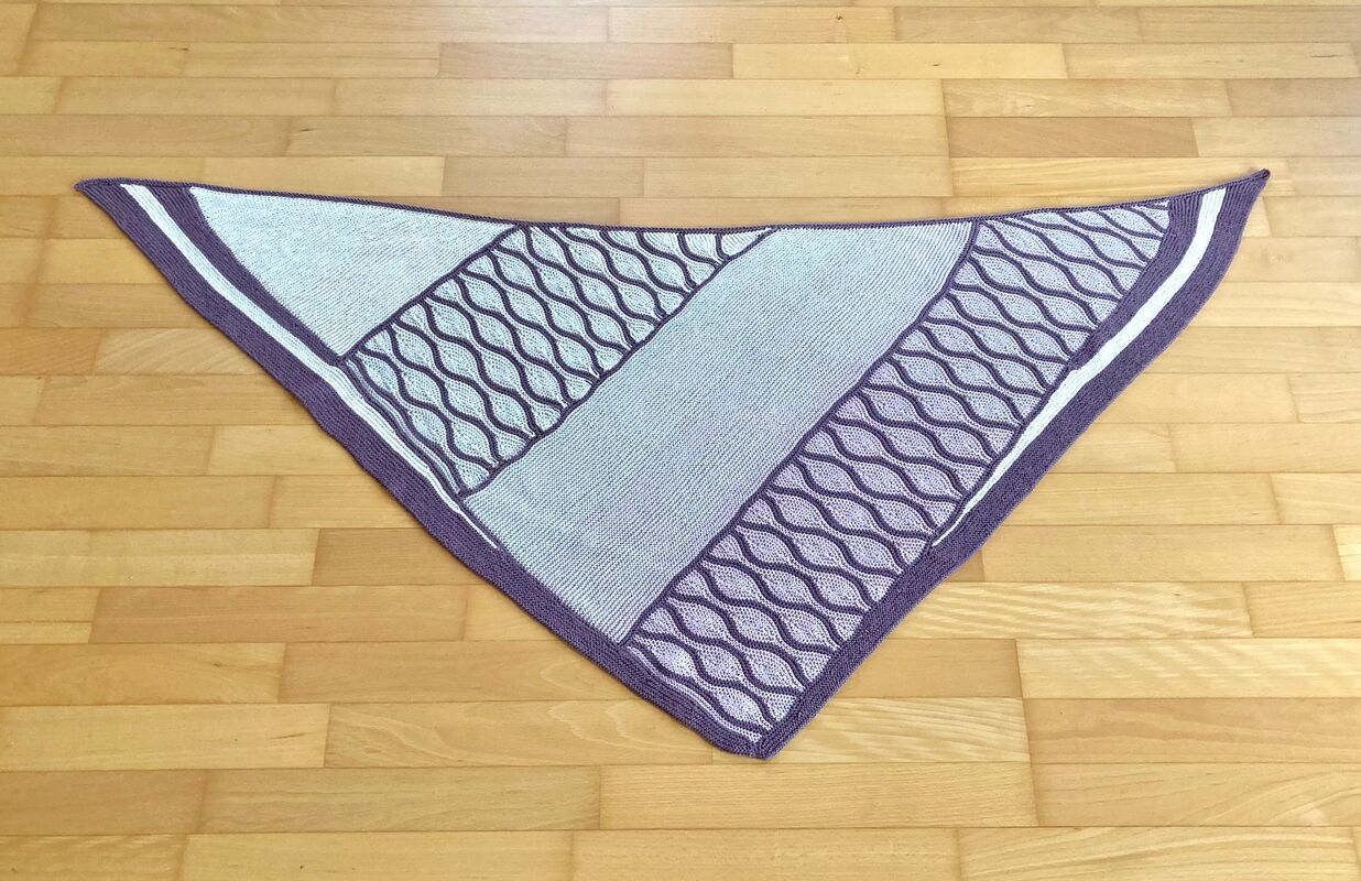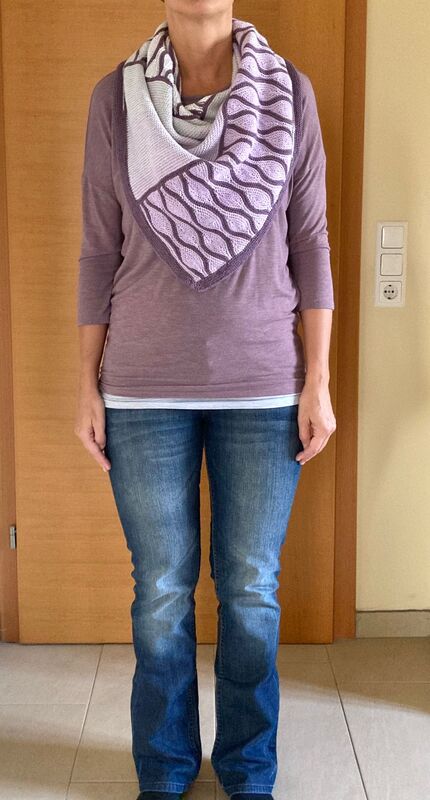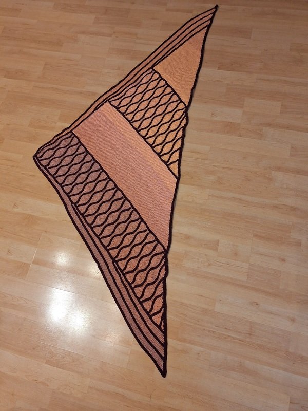 Es ist ein leicht asymmetrisches Dreieckstuch mit vielen verkürzten Reihen.